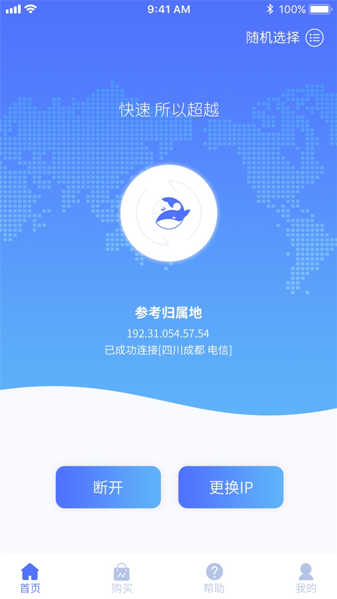 2、更换IP成功后如下图。点击【断开】则断开当前连接,点击【换IP】则继续随机切换IP地址