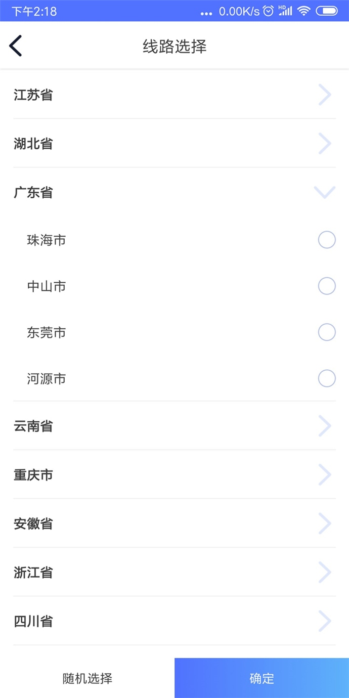 3、点击右上角【随机选择】进入【线路选择】页面,可以根据用户的实际需求进行地域选择