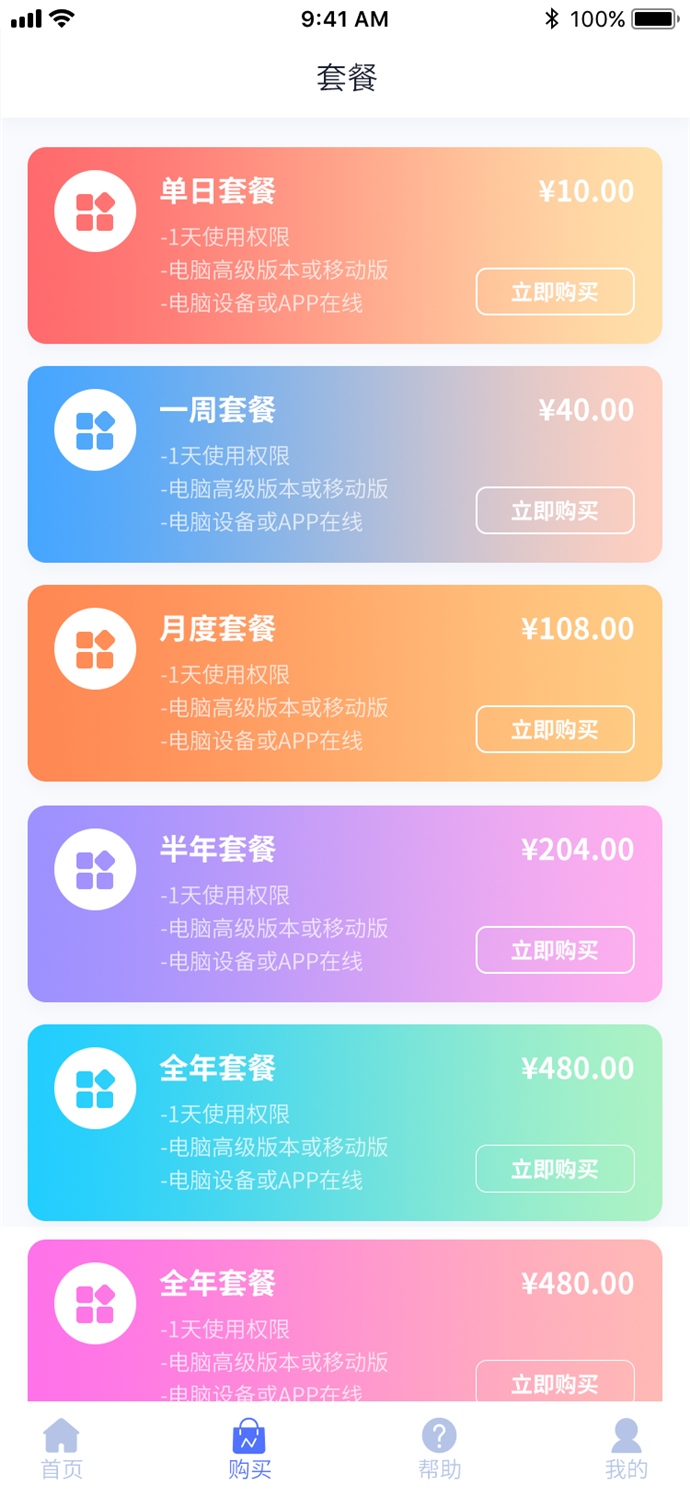 1、在首界面下方点击【购买】,即可进入购买套餐页面,套餐分为单日套餐、单周套餐、月度套餐、季度套餐、半年套餐、年度套餐6个选项,如下图: