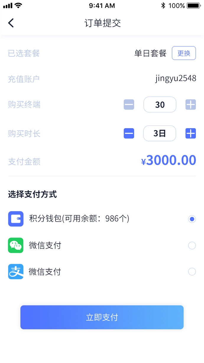 2、选择对应的套餐,进入【订单支付】,依次选择购买的终端数、时长和支付方式,点击【立即支付】完成订单购买